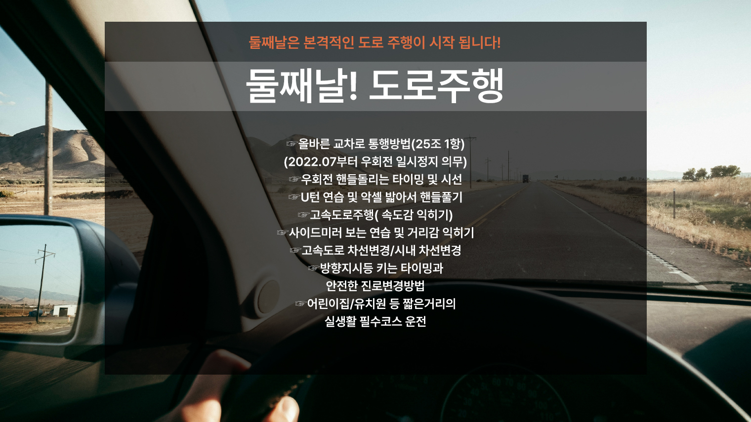 보통 4~6회(회당 2시간) 과정을 추천드립니다. 개인 운전 습관과 숙련도에 따라 코치가 맞춤형으로 커리큘럼을 조정해드려요.